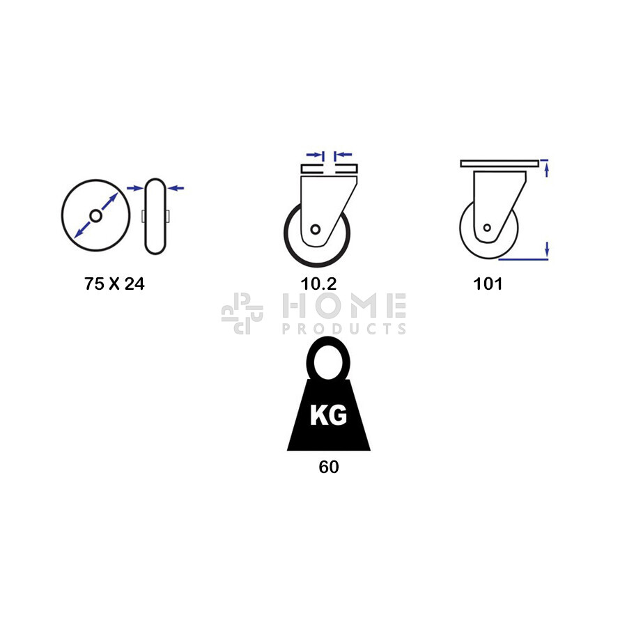 Zwenkwiel, diameter van 75mm, boutgatbevestiging, polypropyleen (PP) wiel, draagvermogen tot 60KG